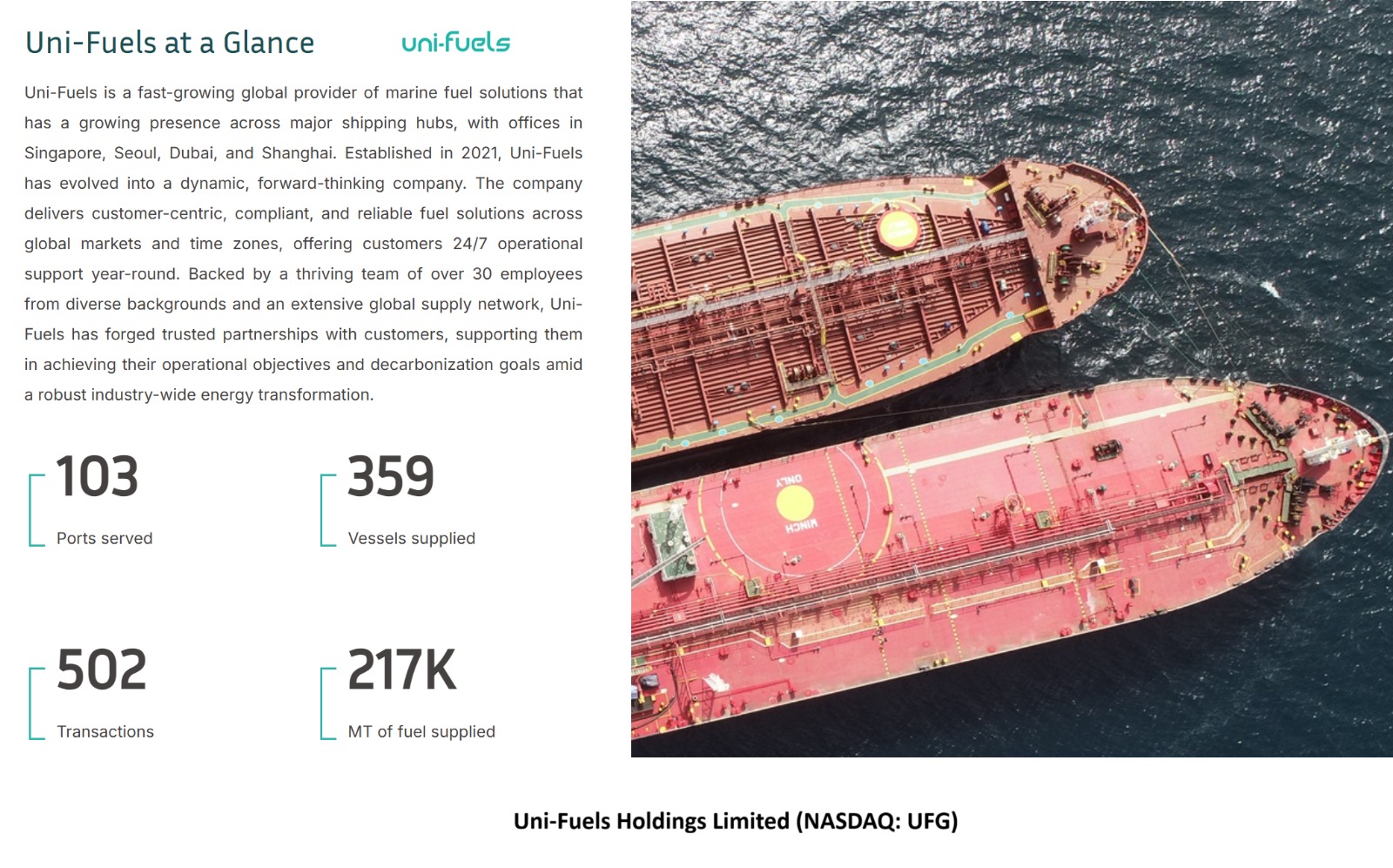 Founded in 2021, Uni-Fuels Holdings Limited is a global provider of marine fuel solutions serving the shipping and logistics industry across major ports in Asia, the Middle East, and beyond. Through its subsidiaries in Singapore, Seoul, Dubai, and Shanghai, Uni-Fuels delivers customer-centric, compliant, and sustainable fuel solutions backed by 24/7 operational support and a rapidly expanding network of global partners.